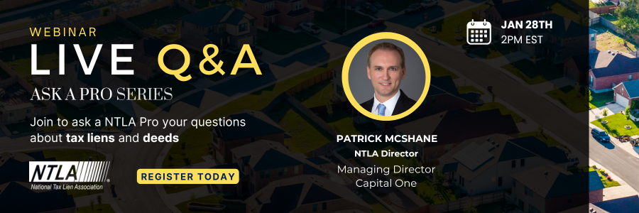 Each month an expert member of the National Tax Lien Association (NTLA) & Certified Tax Lien Professional (CTLP®) will be live for an open forum Q&A session—ready and available to answer your questions on tax liens and deeds.